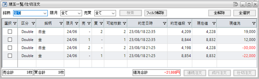 鞘縮小の仕掛け金売り1枚-白金買い2枚を1組を新規で建て、両建て状態です。