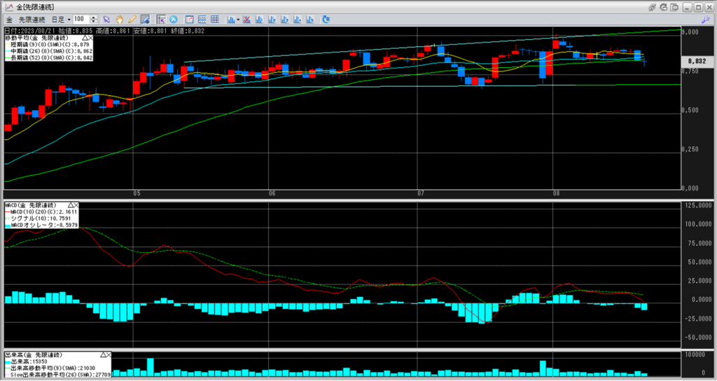 移動平均の短期線は下向き、中期線は上向き、長期線は上向きとなっています。