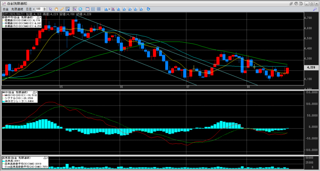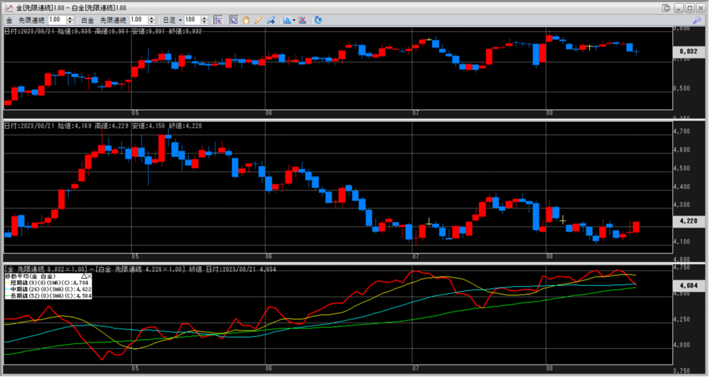 下記に金白金鞘の移動平均線のチャートを貼り付けています。