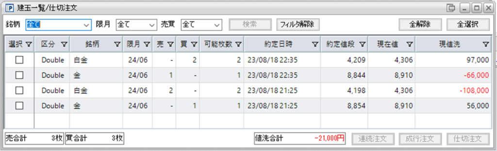 鞘縮小の仕掛け金売り1枚-白金買い2枚を1組の両建て状態です。
