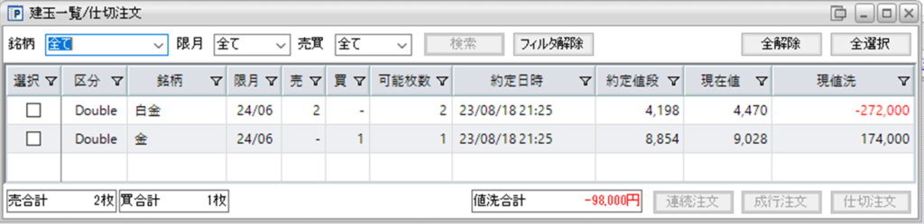 鞘拡大の仕掛金買い1枚-白金売り2枚を1組、保持しています。