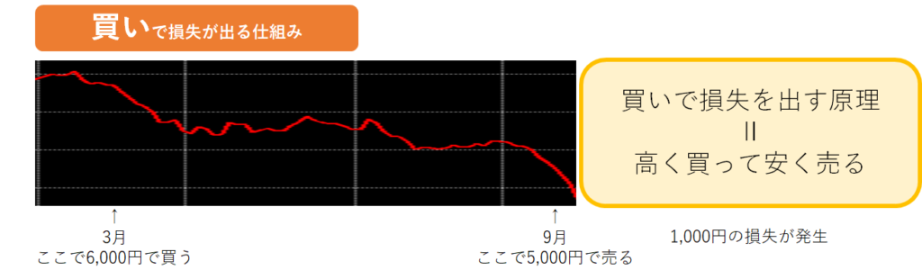 逆に買いから入った場合、値段が下がってしまうと損失が発生してしまいます。