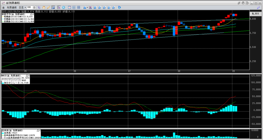 移動平均線の一番上に位置している短期線9,031円を超えて、