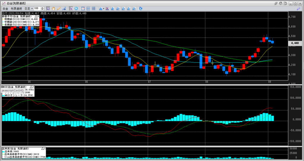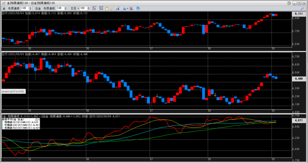 下記に金白金鞘の移動平均線のチャートを貼り付けています。