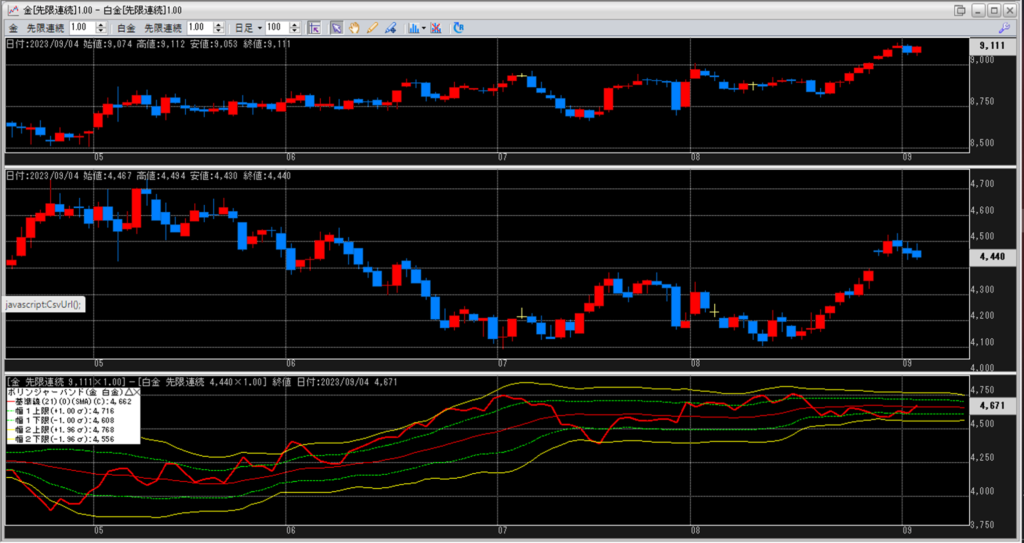 金白金の鞘をボリンジャーバンドで見ていきます。