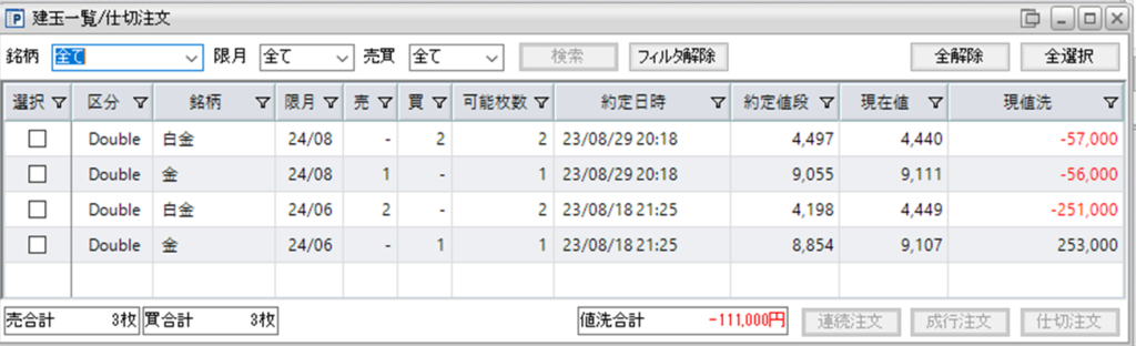 鞘縮小の仕掛け金売り1枚-白金買い2枚を1組の両建て状態になっています。