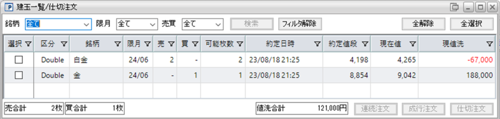 現在、鞘拡大の仕掛金買い1枚-白金売り2枚を1組を保持しています。