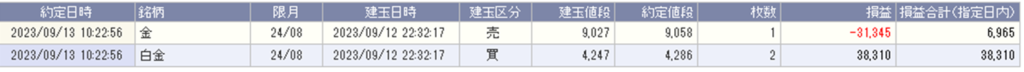 鞘縮小の仕掛け金売り1枚-白金買い2枚を1組は手仕舞っています。