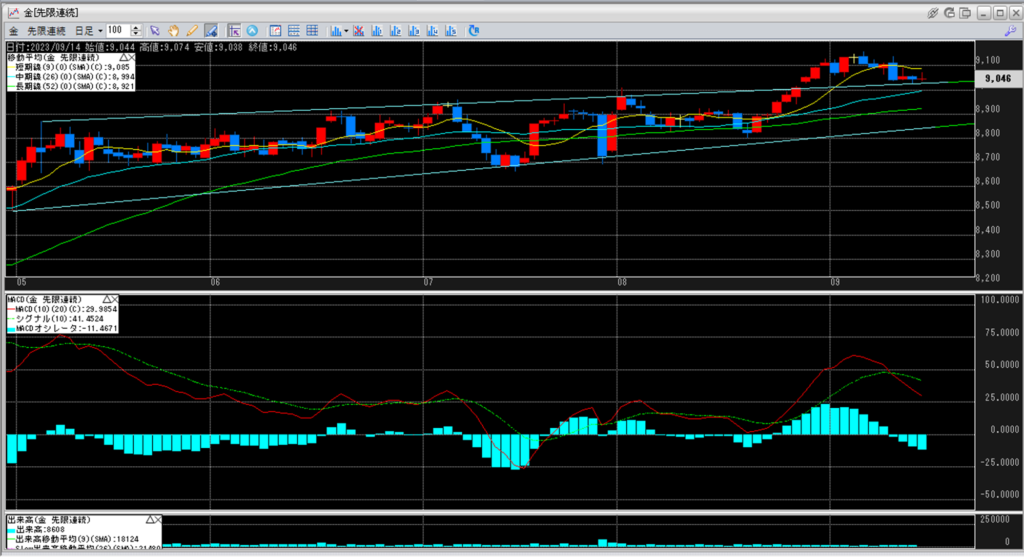 移動平均線の一番上に位置している短期線9,085円を割り込んで、