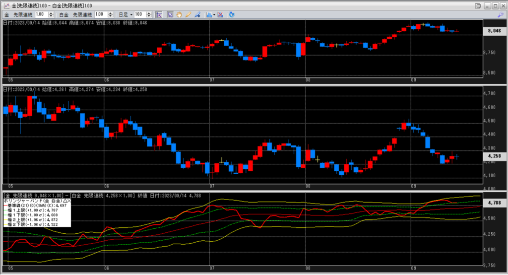 金白金の鞘をボリンジャーバンドで見ていきます。
