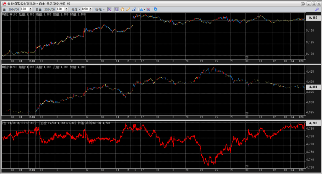 下:金白金鞘(金白金の価格差 = 金1グラムの価格 - 白金1グラムの価格)
