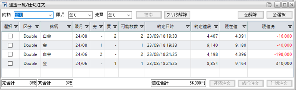 現在、鞘拡大の仕掛金買い1枚-白金売り2枚を1組と