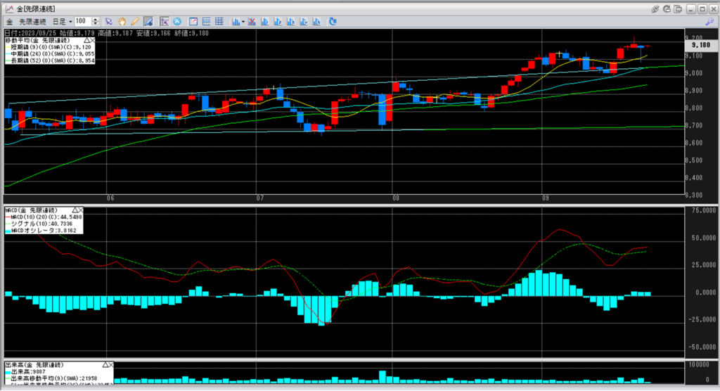 移動平均線の一番上に位置している短期線9,120円を超えて、