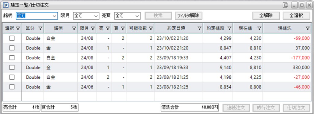 現在、鞘拡大の仕掛金買い1枚-白金売り2枚を1組と