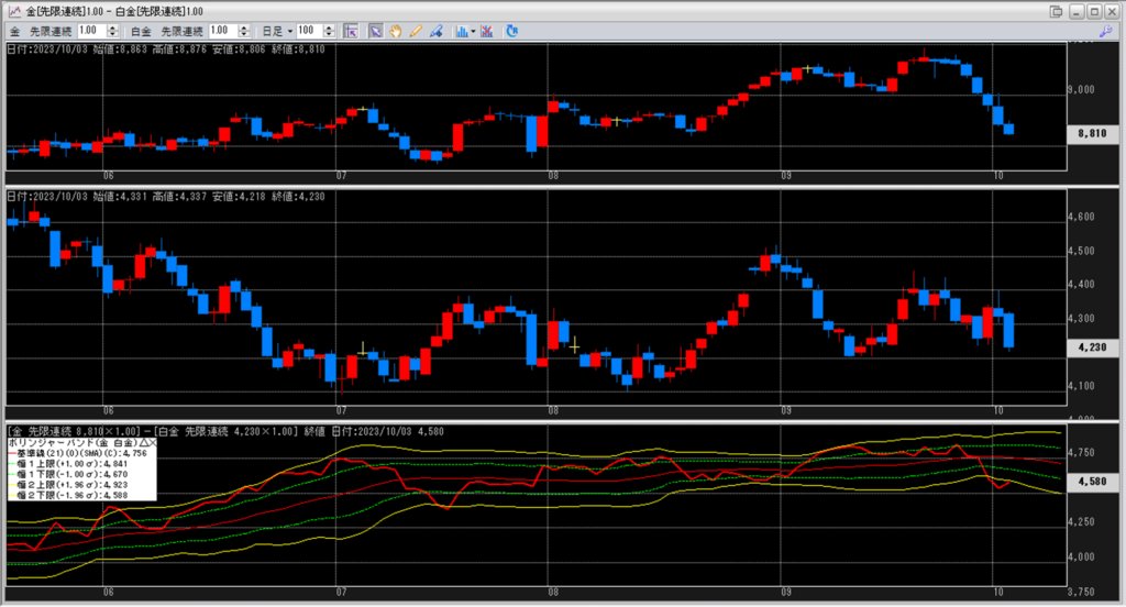 金白金の鞘をボリンジャーバンドで見ていきます。