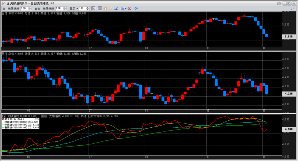 下記に金白金鞘の移動平均線のチャートを貼り付けています。