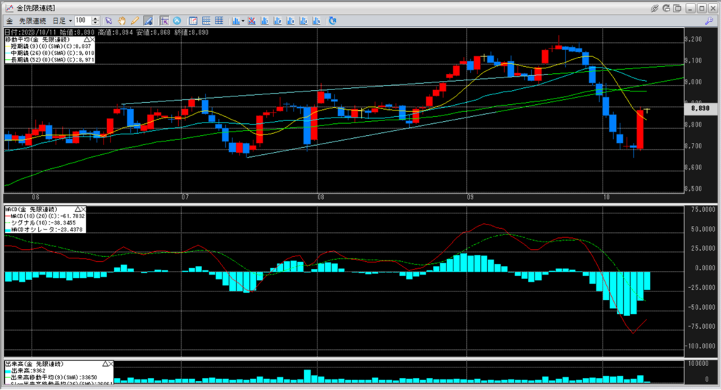 金価格は下落が続いていましたが、8,700円を割れから反発してきています。