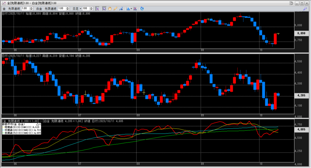 下記に金白金鞘の移動平均線のチャートを貼り付けています。