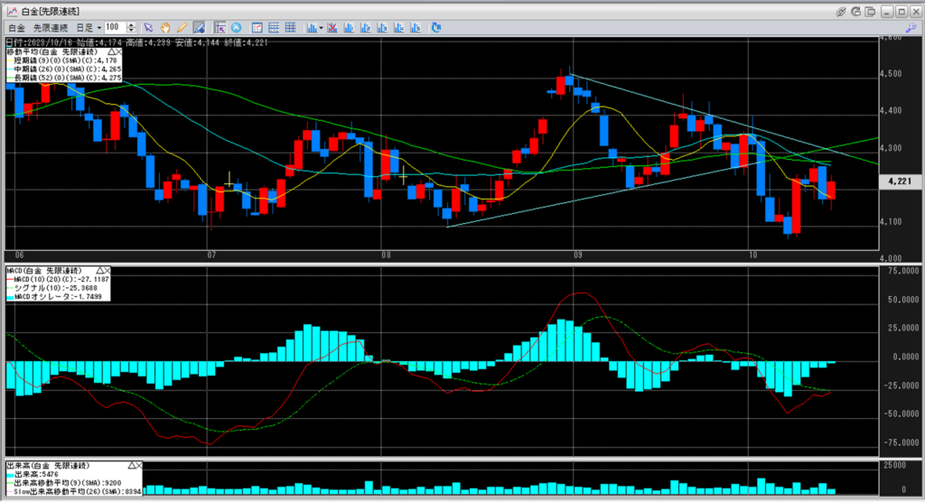 白金のチャートを見ると、4,100円から4,200円を下値とし、