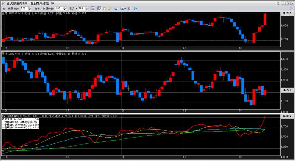 下記に金白金鞘の移動平均線のチャートを貼り付けています。