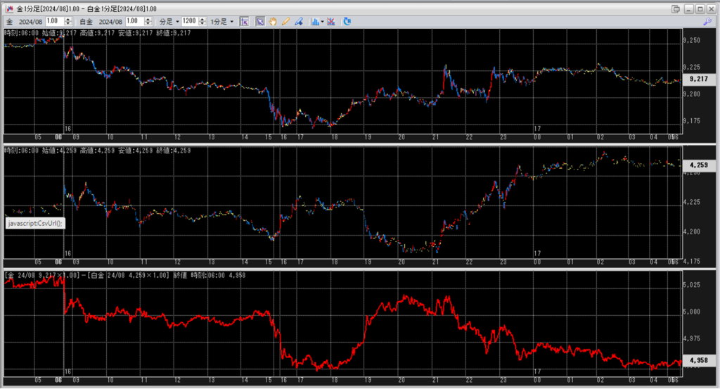下:金白金鞘(金白金の価格差 = 金1グラムの価格 - 白金1グラムの価格)
