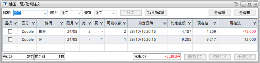 現在、鞘拡大の仕掛け金買い1枚-白金売り2枚を新規で建てています。