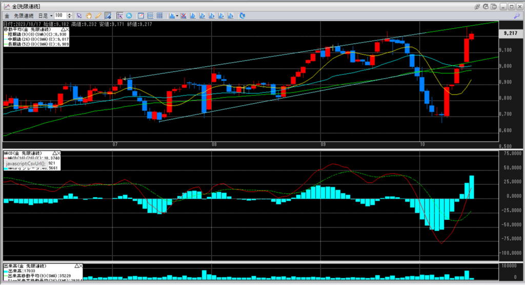 移動平均線の一番上に位置している中期線9,017円を大きく超えて、