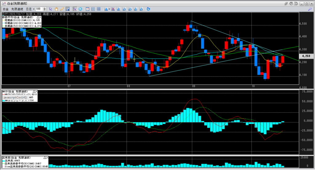 白金のチャートを見ると、4,100円から4,200円を下値とし、