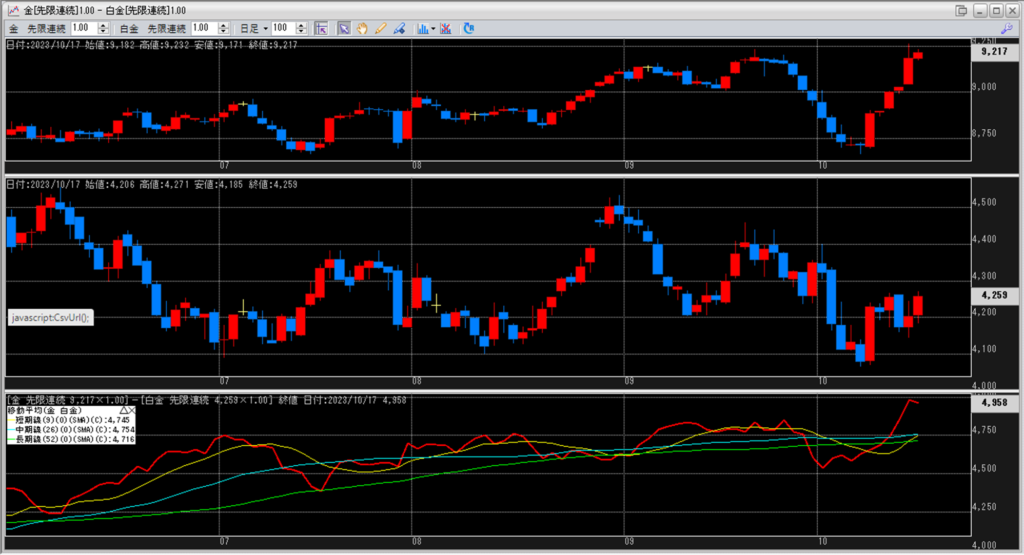 下記に金白金鞘の移動平均線のチャートを貼り付けています。