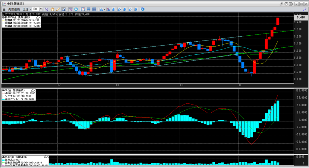 ローソク足で金のチャートを見ると、9営業日連続陽線となっています。