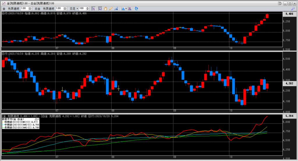 下記に金白金鞘の移動平均線のチャートを貼り付けています。