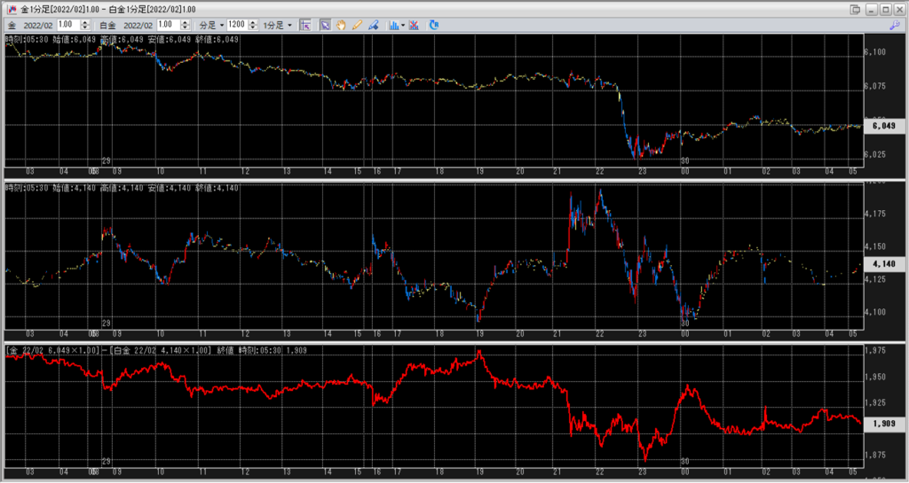 下:金白金鞘(金白金の価格差 = 金1グラムの価格 - 白金1グラムの価格)