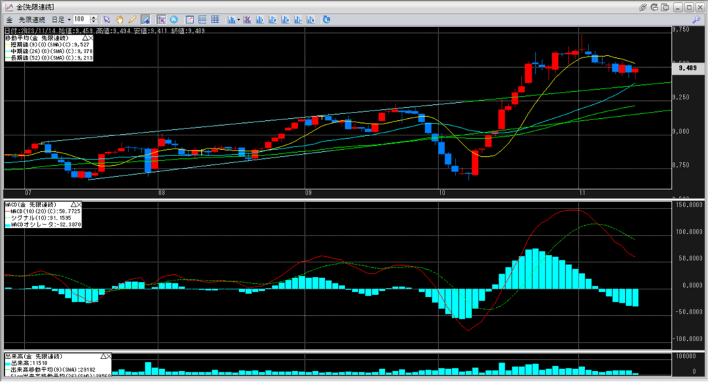 移動平均線の一番上に位置している短期線9,527円を割り込んで、