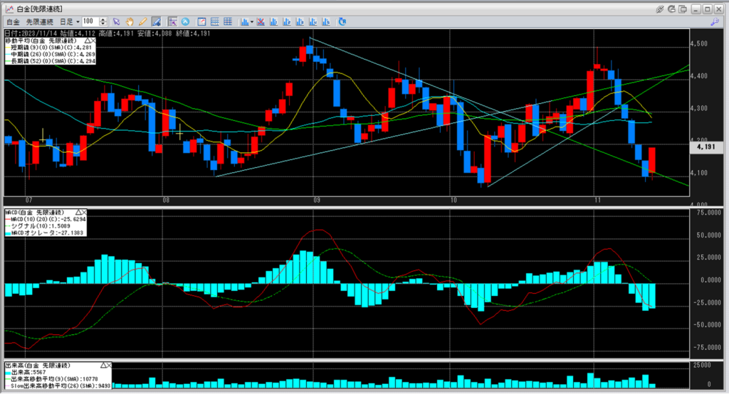 白金のチャートを見ると、4,100円から4,200円を下値とし、