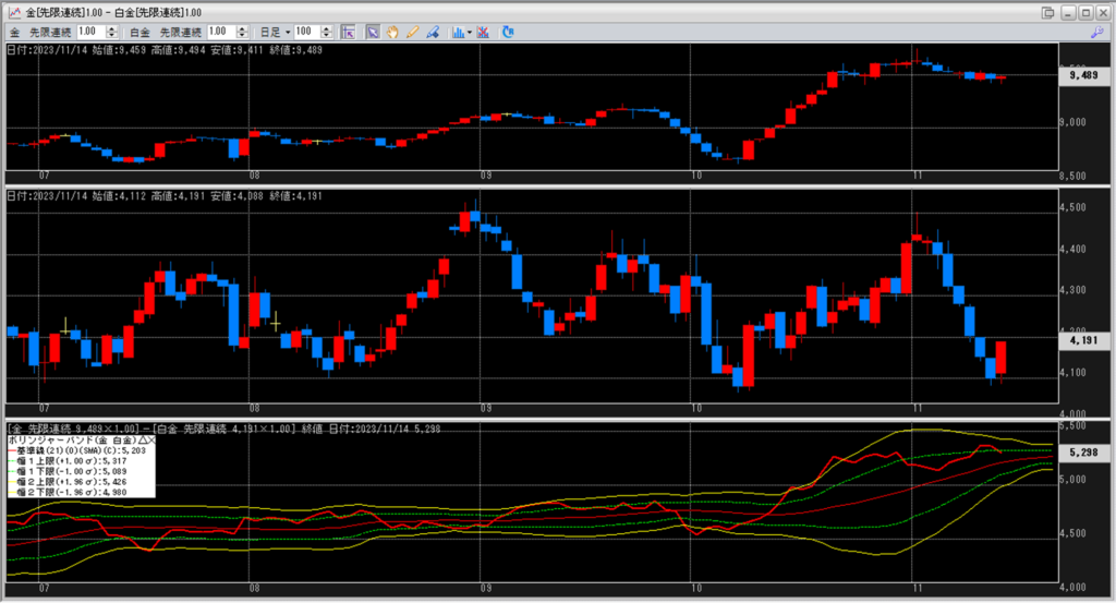 金白金の鞘をボリンジャーバンドで見ていきます。