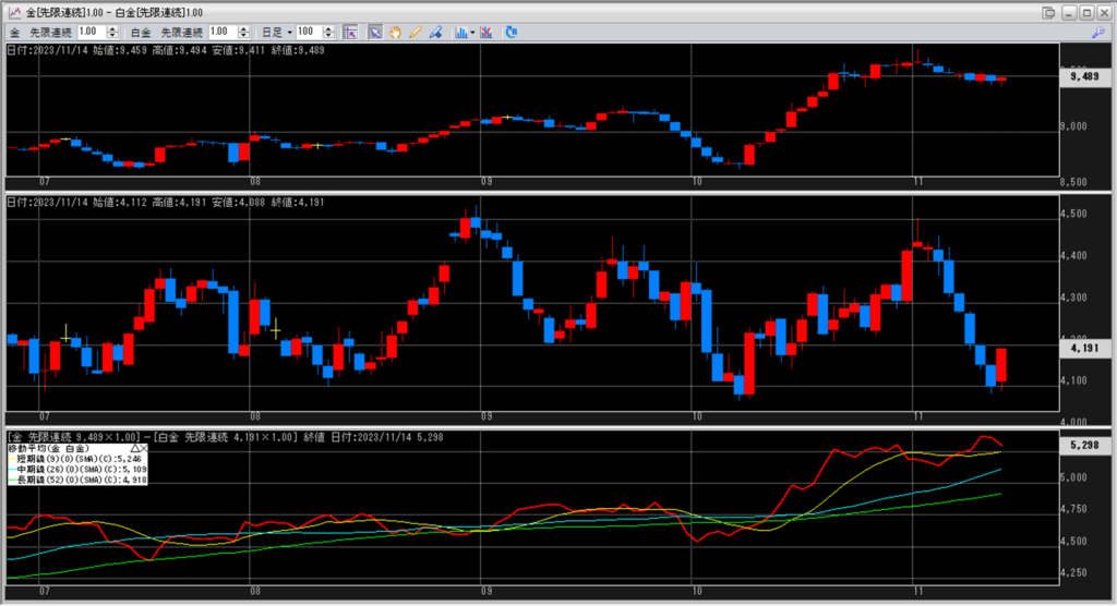 下記に金白金鞘の移動平均線のチャートを貼り付けています。