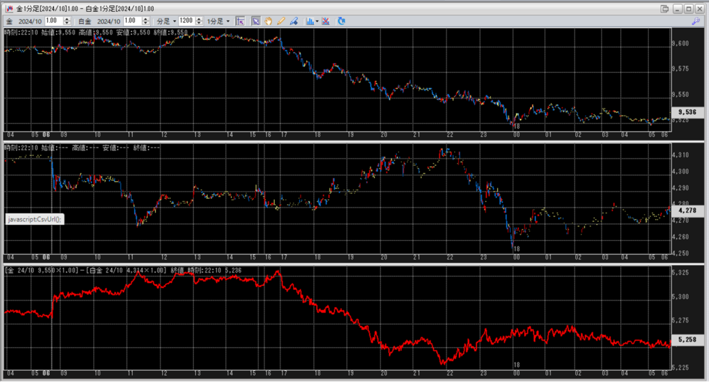 下:金白金鞘(金白金の価格差 = 金1グラムの価格 - 白金1グラムの価格)