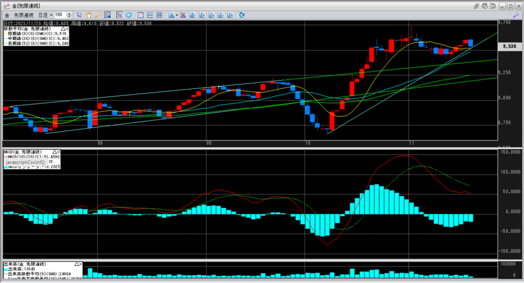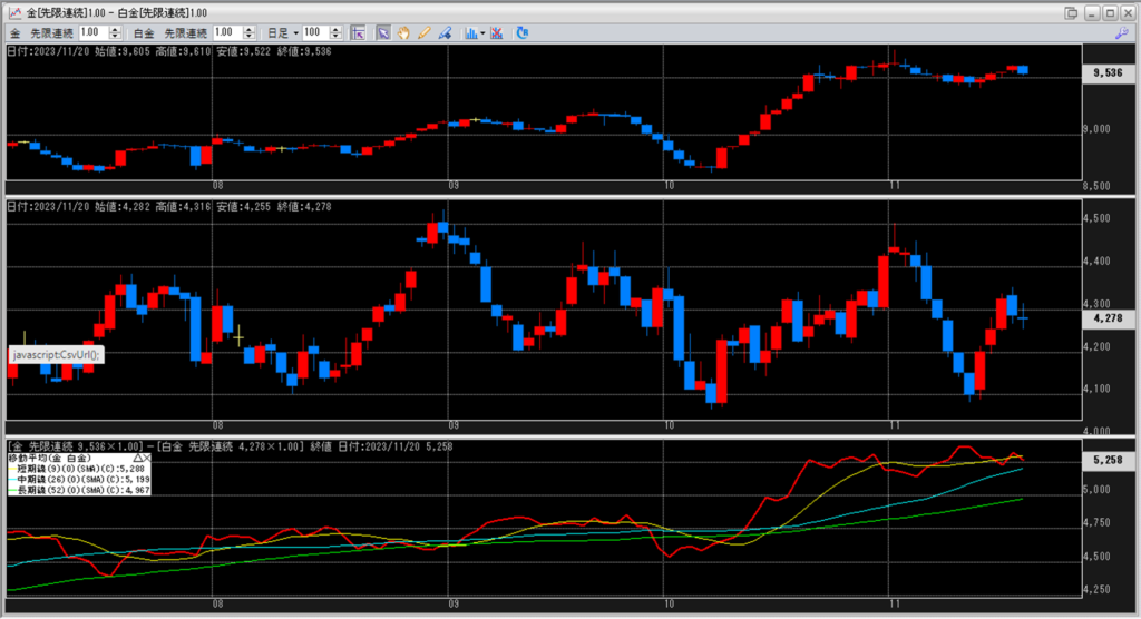 下記に金白金鞘の移動平均線のチャートを貼り付けています。