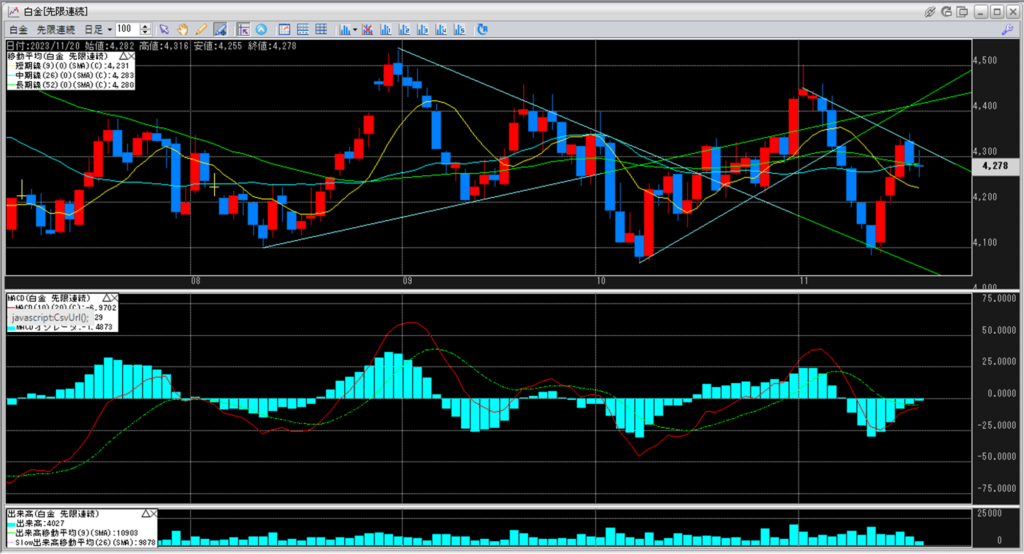 白金のチャートを見ると、4,100円から4,200円を下値とし、