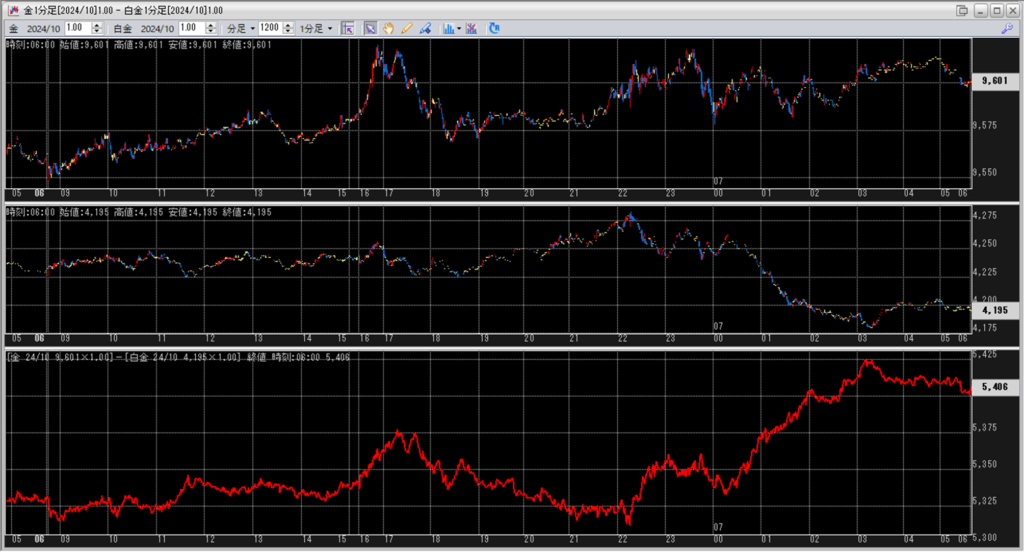 下:金白金鞘(金白金の価格差 = 金1グラムの価格 - 白金1グラムの価格)