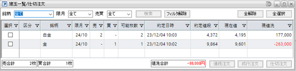 鞘拡大の仕掛け金買い1枚-白金売り2枚を1組、保持しております。