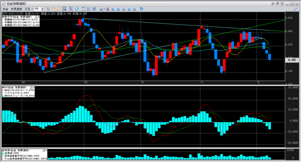白金のチャートを見ると、4,100円から4,200円を下値とし、