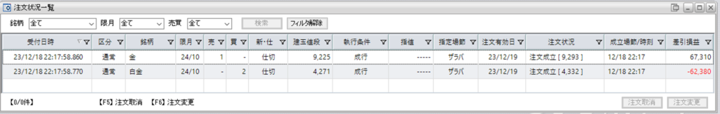 一旦、鞘拡大の仕掛け金買い1枚-白金売り2枚を1組、仕切りました。