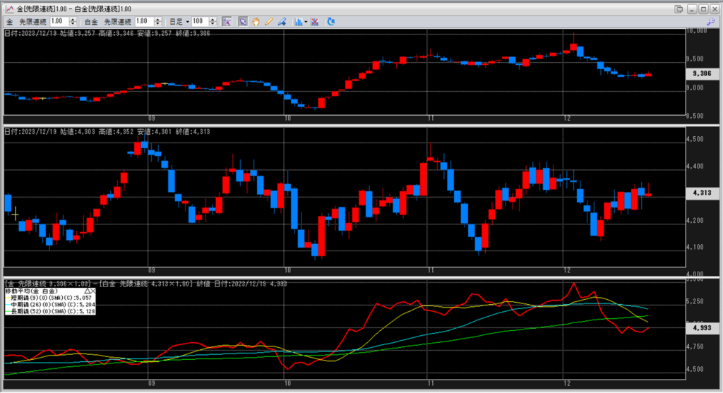 下記に金白金鞘の移動平均線のチャートを貼り付けています。