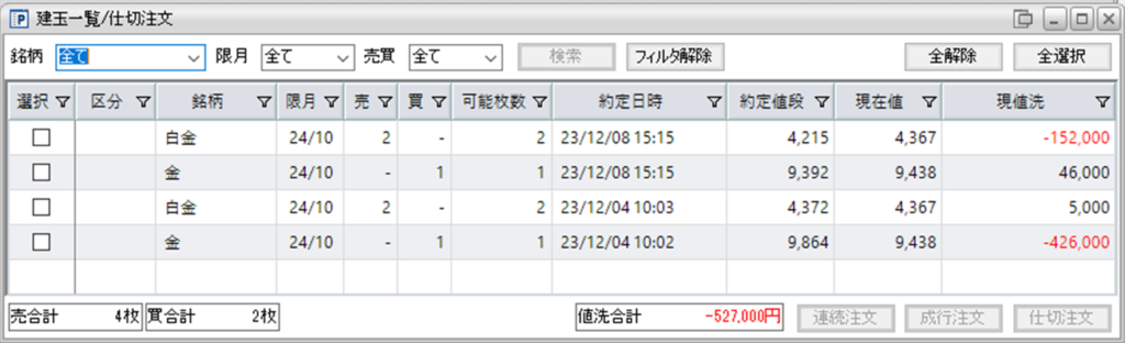 鞘拡大の仕掛け金買い1枚-白金売り2枚を2組、保持しております。
