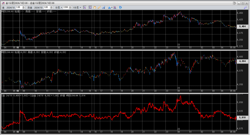 下:金白金鞘(金白金の価格差 = 金1グラムの価格 - 白金1グラムの価格)