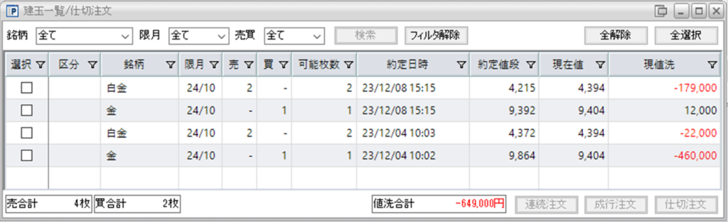 鞘拡大の仕掛け金買い1枚-白金売り2枚を2組、保持しております。