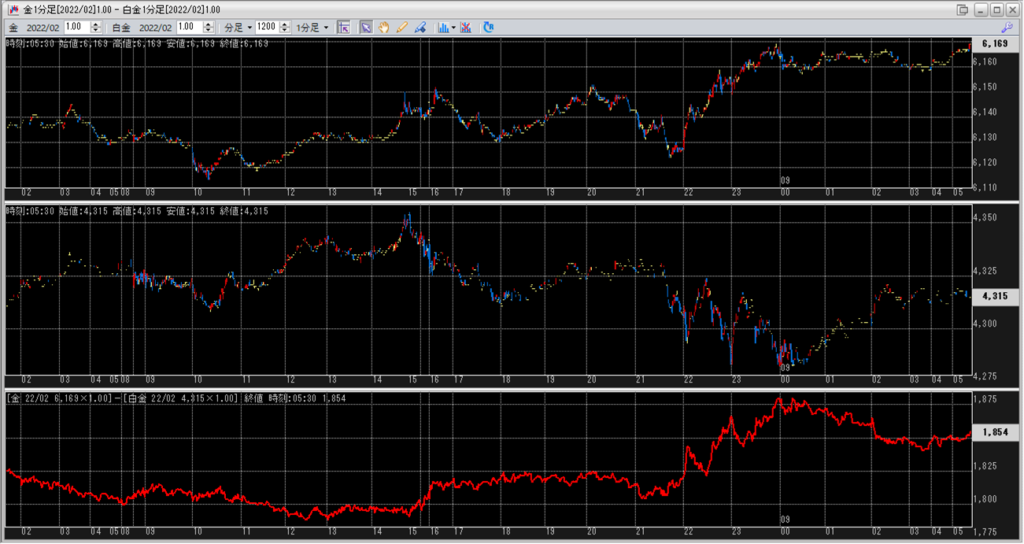 下:金白金鞘(金白金の価格差 = 金1グラムの価格 - 白金1グラムの価格)