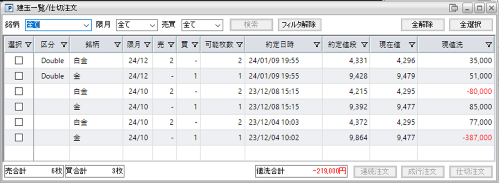 鞘拡大の仕掛け金買い1枚-白金売り2枚を3組、保持しております。