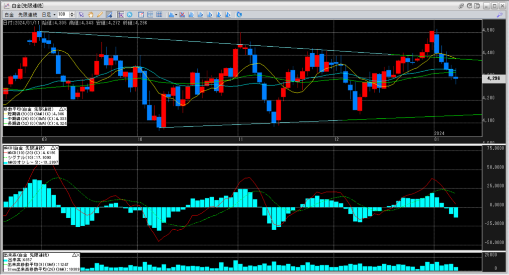 白金のチャートを見ると、4,100円から4,200円を下値とし、